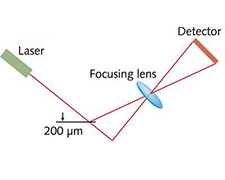 在激光三角檢測技術(shù)中,用一精細(xì)聚焦的激光束來掃描圓片表面,光學(xué)系統(tǒng)將反射的激光聚焦到探測器(圖1)。采用3D激光三角檢測術(shù)來檢測微凸點的形貌時,在精度、速度和可檢測性等方面它具有明顯的優(yōu)勢。這一檢測技術(shù)目前所面臨的挑戰(zhàn)包括有凸點的尺寸和凸點之間的間隔都很小,以及在整個圓片上布滿有數(shù)百萬個凸點。