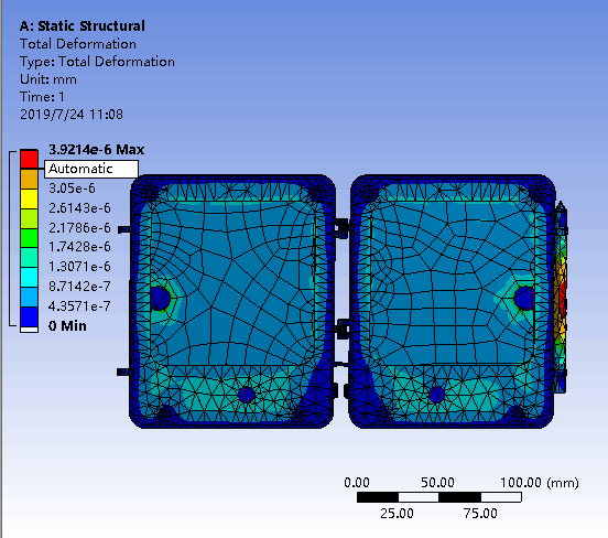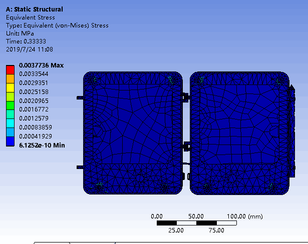 對于折疊式手寫板所材料屬性也都大同小異,所加載荷為底板固定,上面給一個壓力載荷.從結(jié)果可見手寫板完全承受在正常使用情況下所受的力.