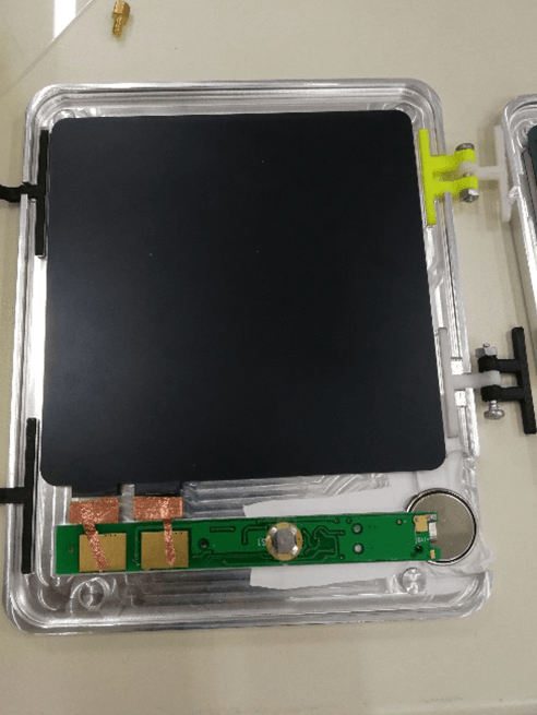 第二大困難是電路板的連接問題.由于我們需要把電路板和電池舒適地放置在槽中,我們把電路板進行了稍微的改造,用導(dǎo)電帶實現(xiàn)正負極連接,使電池得以平放.然而由于電路板與液晶膜極其敏感脆弱,研究如何連接才能使其正常工作花了我們較長時間,甚至燒壞了不止一塊電路板.