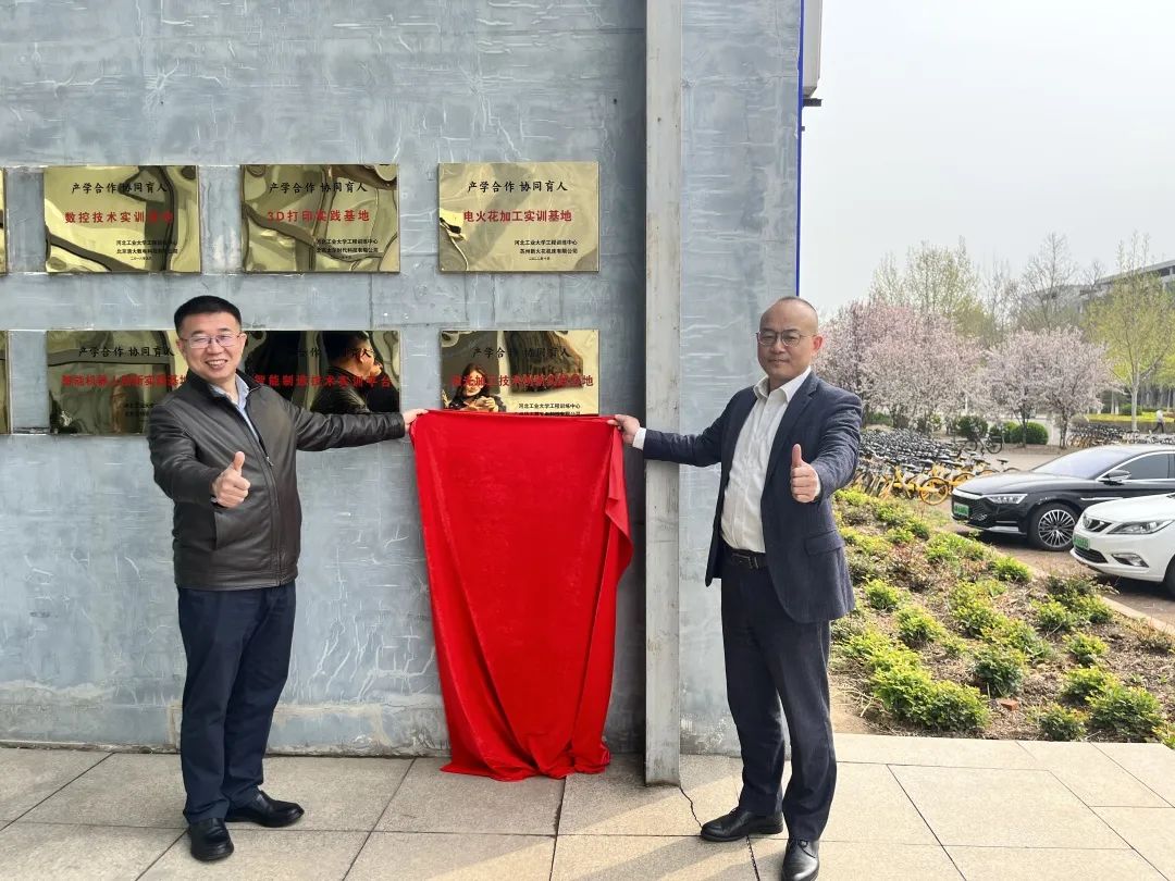 河北工業大學工程訓練中心馬主任(左)與廣州華之尊光電科技有限公司秦斌總經理(右)為『激光加工技術創新實踐基地』揭牌。