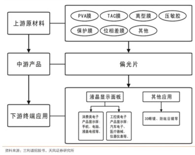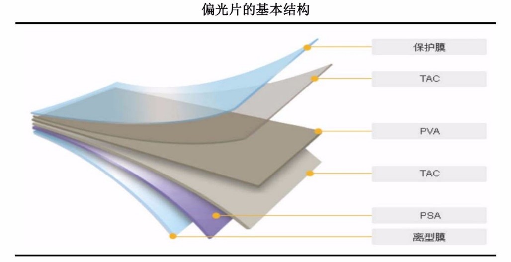 偏光片的全稱是偏振光片,是一種具有特殊光學(xué)特性的材料,能夠選擇性地吸收、透射或反射特定方向的光線,從而實(shí)現(xiàn)光的偏振作用。主要由TAC膜、PVA膜、保護(hù)膜、增量膜、壓敏膠、相位差膜等復(fù)合而成,具有高度透明性和柔韌性。基本結(jié)構(gòu)是兩層TAC膜,夾一層拉伸后的PVA膜。通過(guò)調(diào)整不同的膜材料構(gòu)成可以滿足偏光片的高耐性、不同厚度等要求。