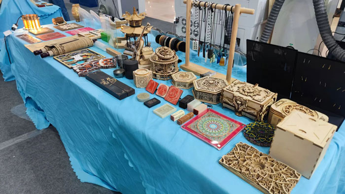 華之尊激光此次展出了多軸激光焊接/清洗機、激光打標機、激光雕切一體機等多個領域激光設備,這些設備廣泛應用于所有藝術設計類專業,如:建筑裝飾、工藝美術、服裝服飾、陶瓷藝術、產品設計、平面視覺等各類專業。以下是華之尊激光在展會上的一些創新展示: